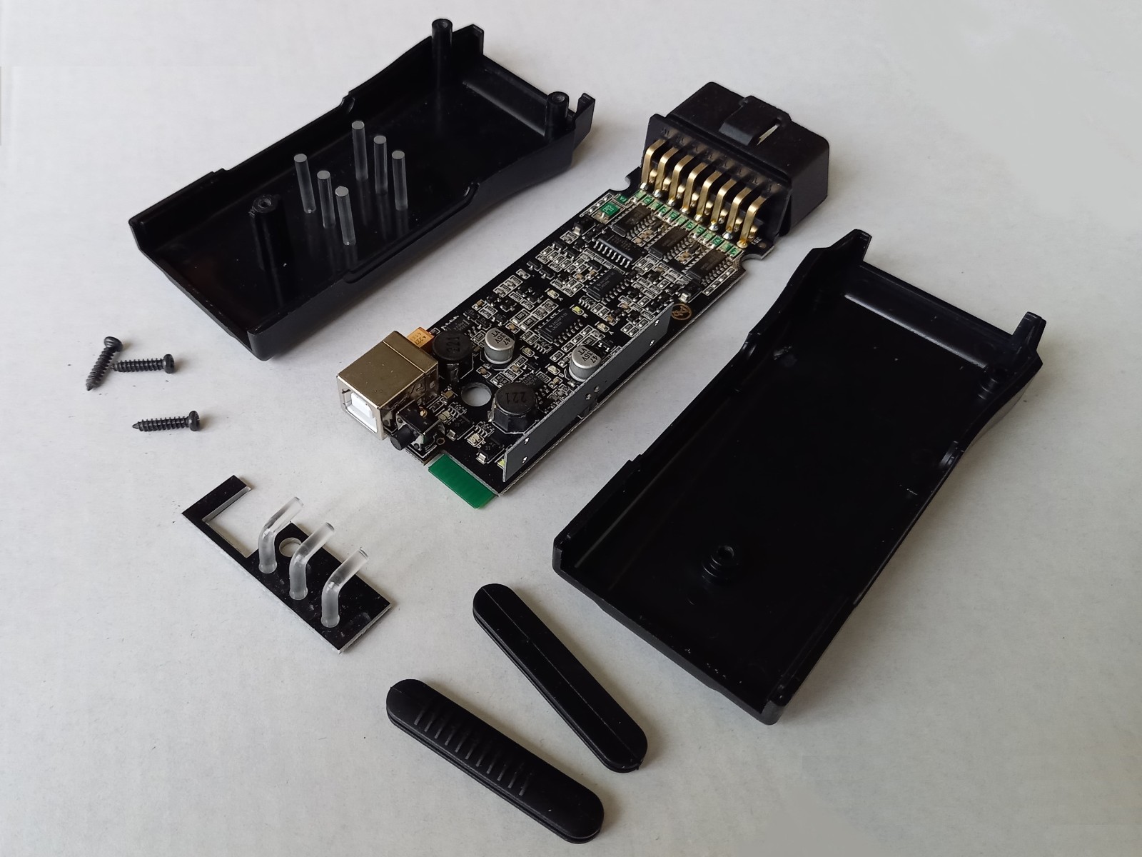 - built-in solid state relays multiplexer for OBDII-pins 1,2,3,6,13 and 9,10,11,12,14